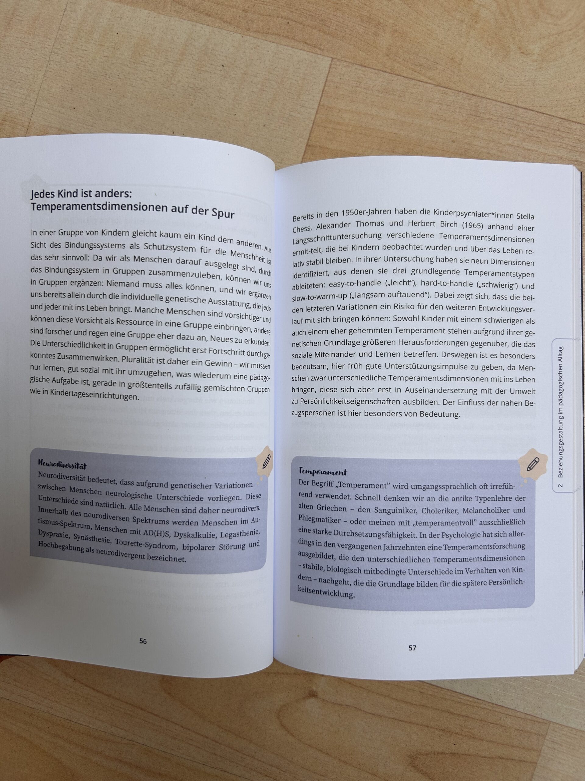 Das Buch liegt toll in der Hand – ein schönes haptisches Gefühl hilft mir beim lesen ebenso wie eine klare Struktur und farbliche Unterscheidungen. All das hat Susanne in diesem Buch toll umgesetzt. Der Aufbau ist klar: Es geht um die Bedeutung sicherer Bindungen über die Eingewöhnung und Beziehungsarbeit im Alltag bis hin zur Zusammenarbeit im Team und mit Eltern.