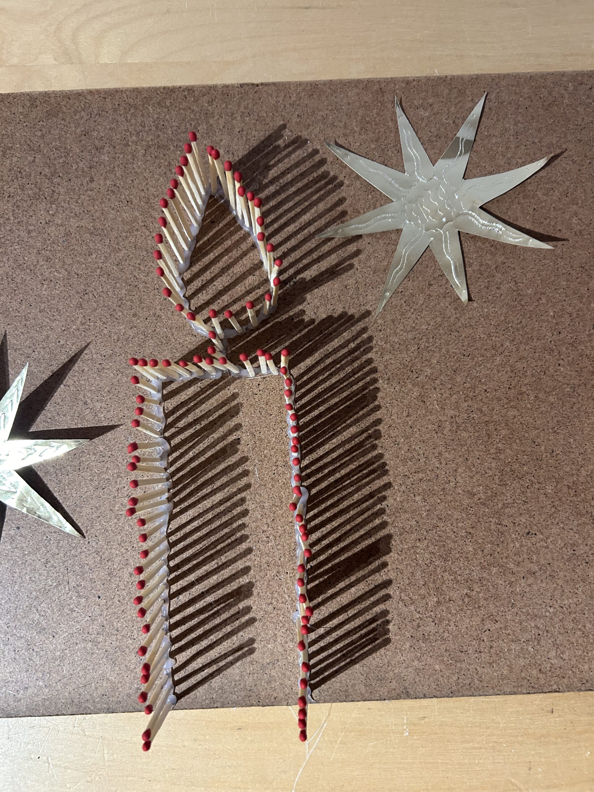 Zeichne auf einer feuerfesten Unterlage eine Kerze vor. Dann spure mit Heißkleber das Motiv Stück für Stück nach und stecke Streichhölzer in die Klebespur, immer mit dem roten Kopf nach oben. Achte darauf, dass die Streichhölzer eng beieinander stehen.