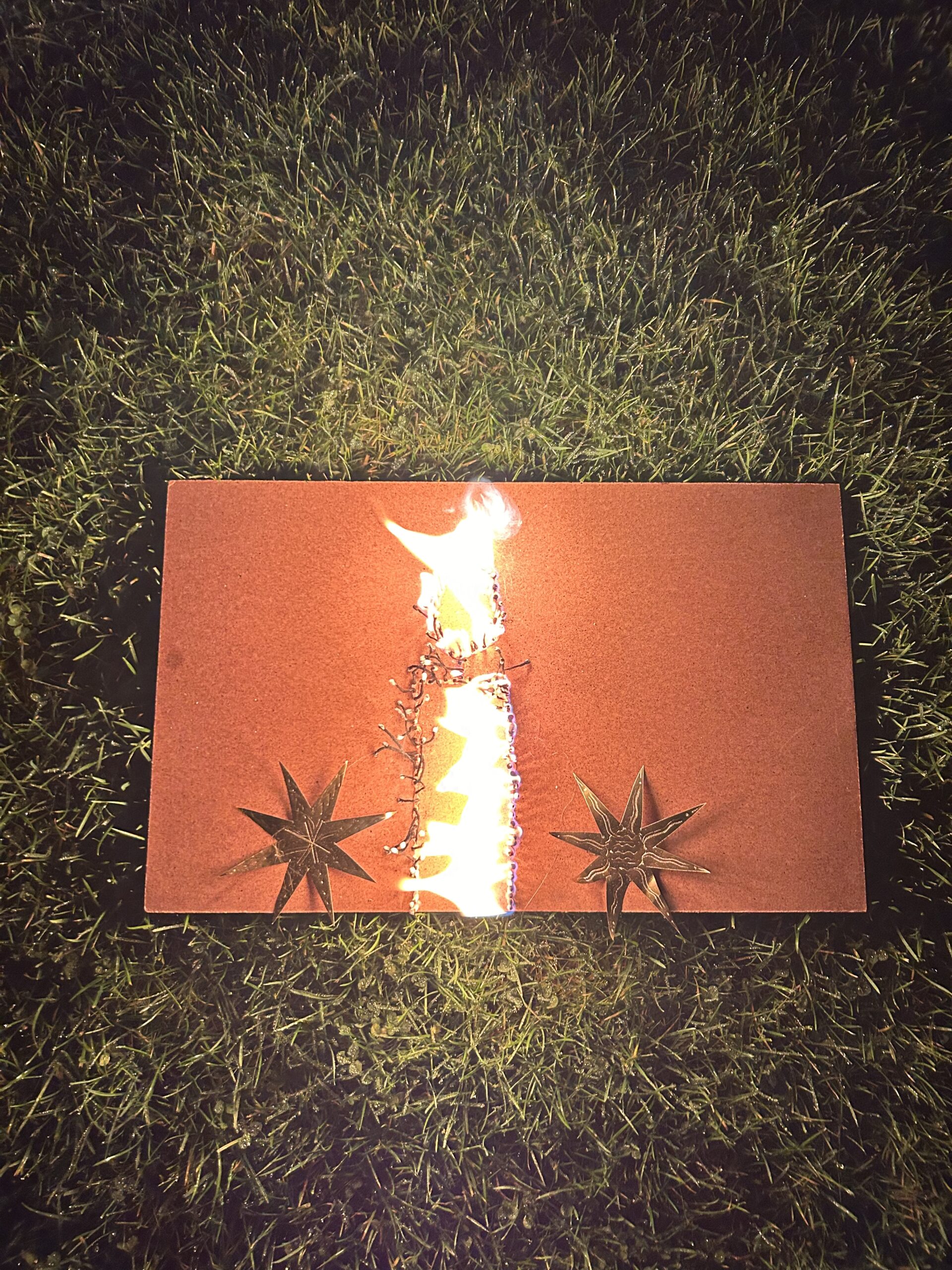 Sowie du ein Streichholz entzündest, breitet sich das Feuer von alleine aus, sodass bald das ganze Motiv leuchtet. Bis zum Heißkleber herunter-gebrannt, geht es von alleine aus. Lösche zur Sicherheit alles mit Wasser ab.
