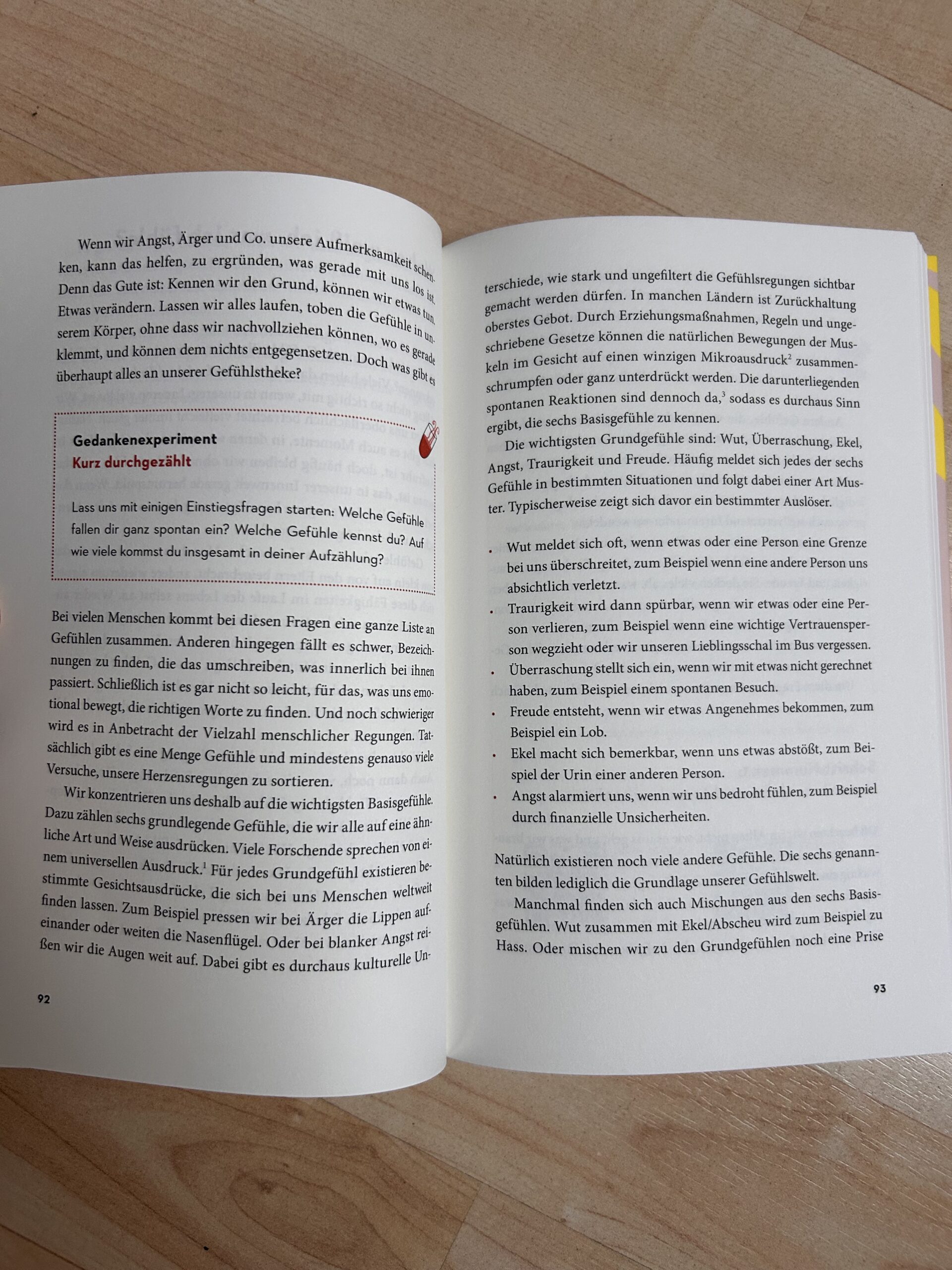 Nach dieser Einführung Findet man nun eine Anleitung, wie man zurück zur Mitte kommen kann. Auf mehreren Seiten gibt es Ideen, wie man Gefühle leichter verarbeiten kann? Hier findet ihr ganz praktische Anleitungen und Tipps. Experimente und Anregungen auch um mit anderen darüber zu sprechen. Ich finde das sehr sinnvoll, kenne aber aus meiner jahrelangen Therapie schon viele dieser Elemente. Fokusverlagerung, annehmen, Aufmerksamkeit verschieben, Gutes tun, Bedürfnisse benennen (und bewusst werden) und vieles mehr.