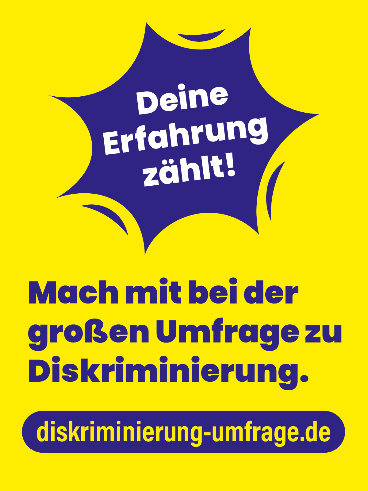 Vom 12. November 2025 bis 28. Februar 2026 führt die Antidiskriminierungsstelle des Bundes die bislang größte Umfrage zu Diskriminierung in Deutschland durch. Um möglichst viele Menschen für eine Teilnahme zu gewinnen, wird die Umfrage mit einer bundesweiten Kampagne bekannt gemacht.