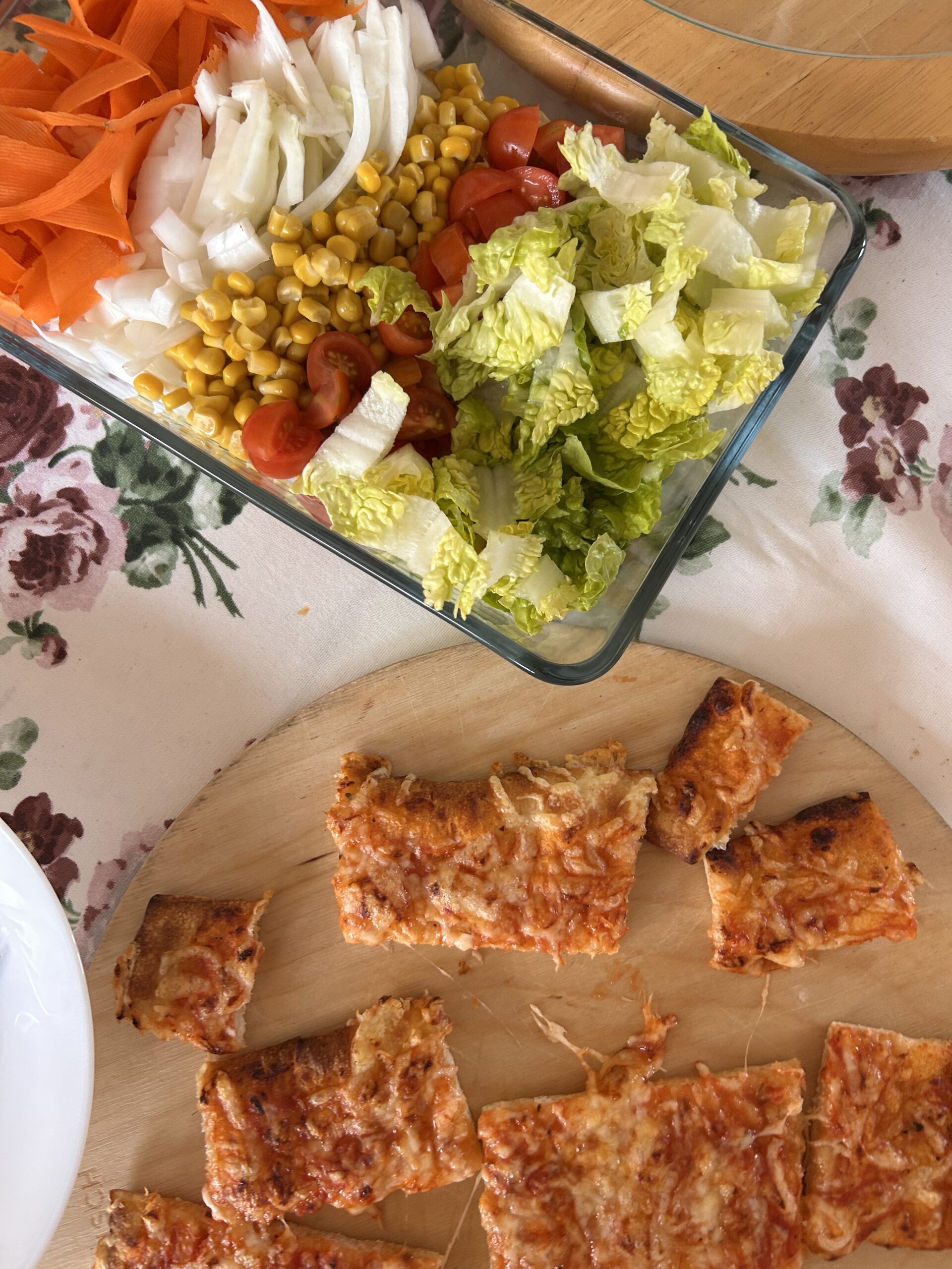 Schnelles Mittagessen, Pizzastücke mit buntem Selbstmach – Salat