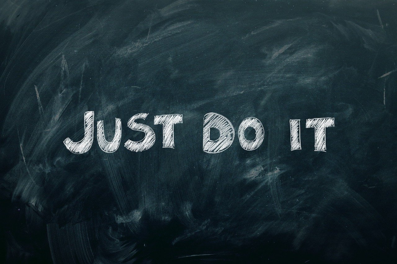 Weiße Kreideschrift auf schwarzer Tafel mit den Worten JUST DO IT